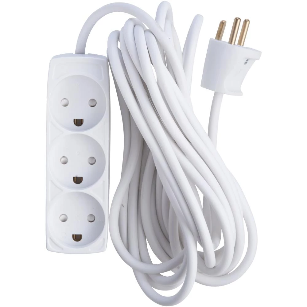 Hvid stikdåse med jord og 5 mtr. ledning 3G1 mm² H05VV-F. 230 V, 13 A. 2.990 W. Bornesikret model. Fås i flere varianter.