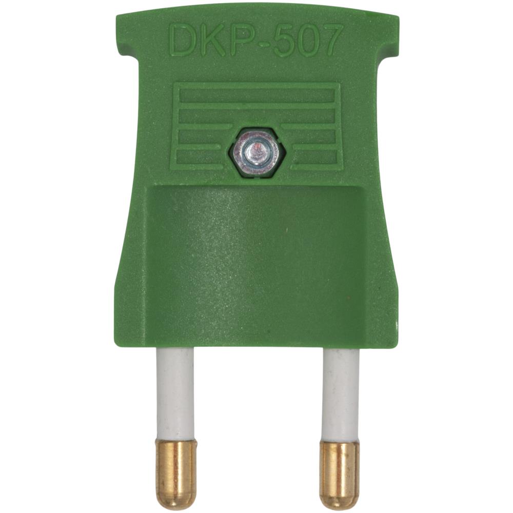 Grøn flad stikprop, eller grøn forlængerled. Begge uden jord, og i ekstra forstærket plast. 230 V, 16 A.