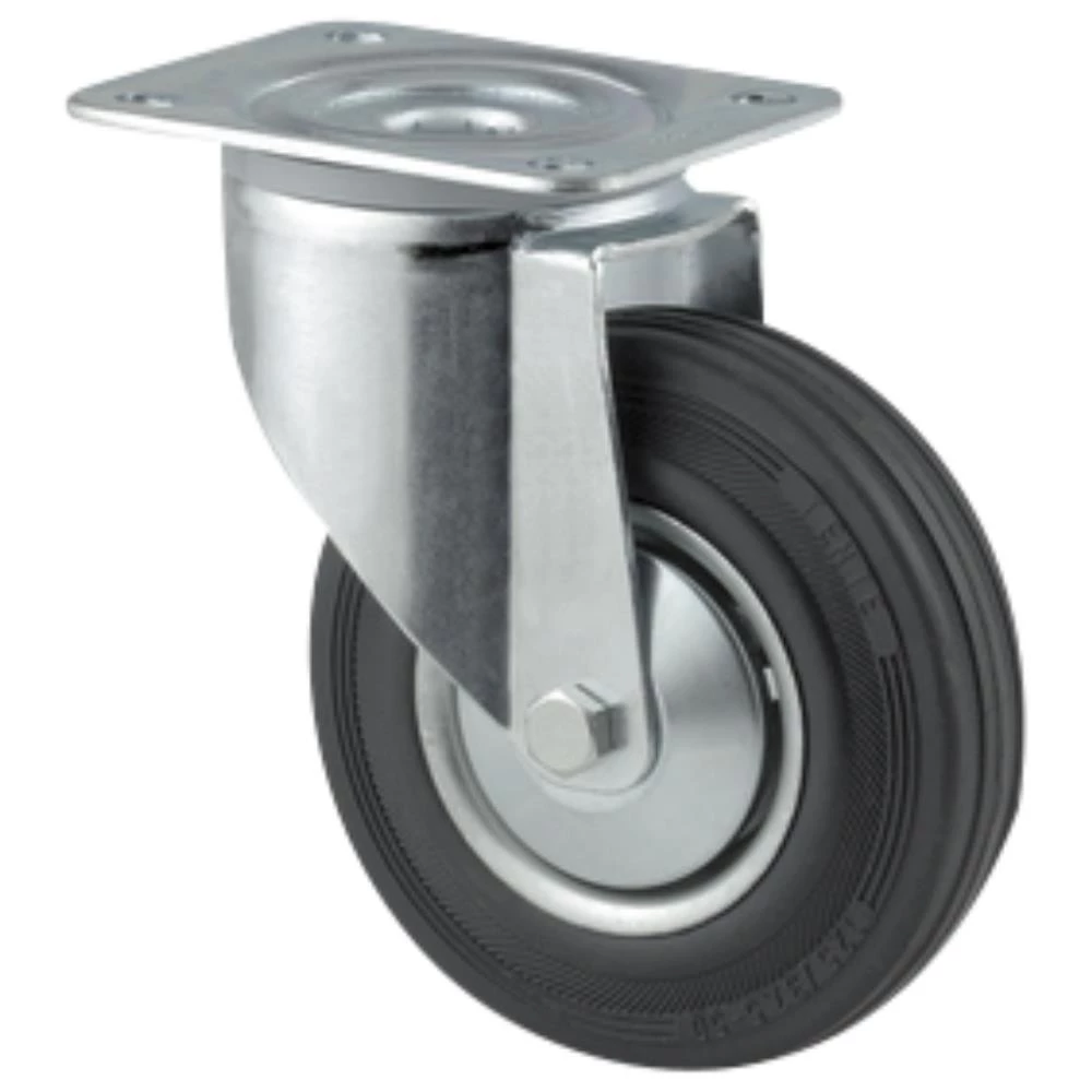 Drejeligt hjul med gaffel i svær stålplade med bred gaffelform og dobbelt kuglekrans. Hjulfælg i svejst stål og hjulbane i sort massiv gummi og rulleleje. Med plade. Fås i flere dimensioner.