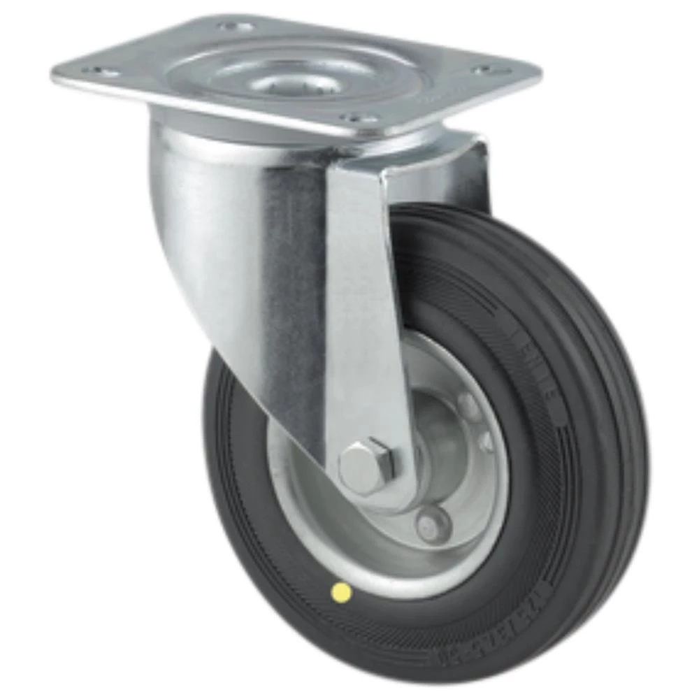 Drejeligt dobbelthjul med gaffel i svær stålplade med bred gaffelform og dobbelt kuglekrans. Hjulfælg i svejst stål og hjulbane sort ESD gummi samt rulleleje. Med plade. Fås i flere dimensioner.