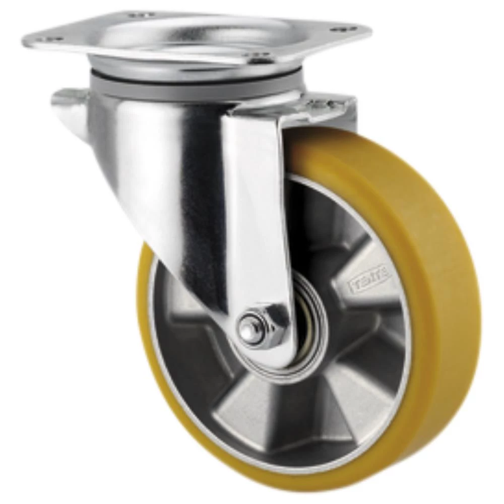 Drejeligt dobbelthjul med gaffel i svær stålplade med bred gaffelform og dobbelt kuglekrans. Nav i aluminium med polyuretanbane samt DIN-kugleleje. Med plade. Fås i flere dimensioner.