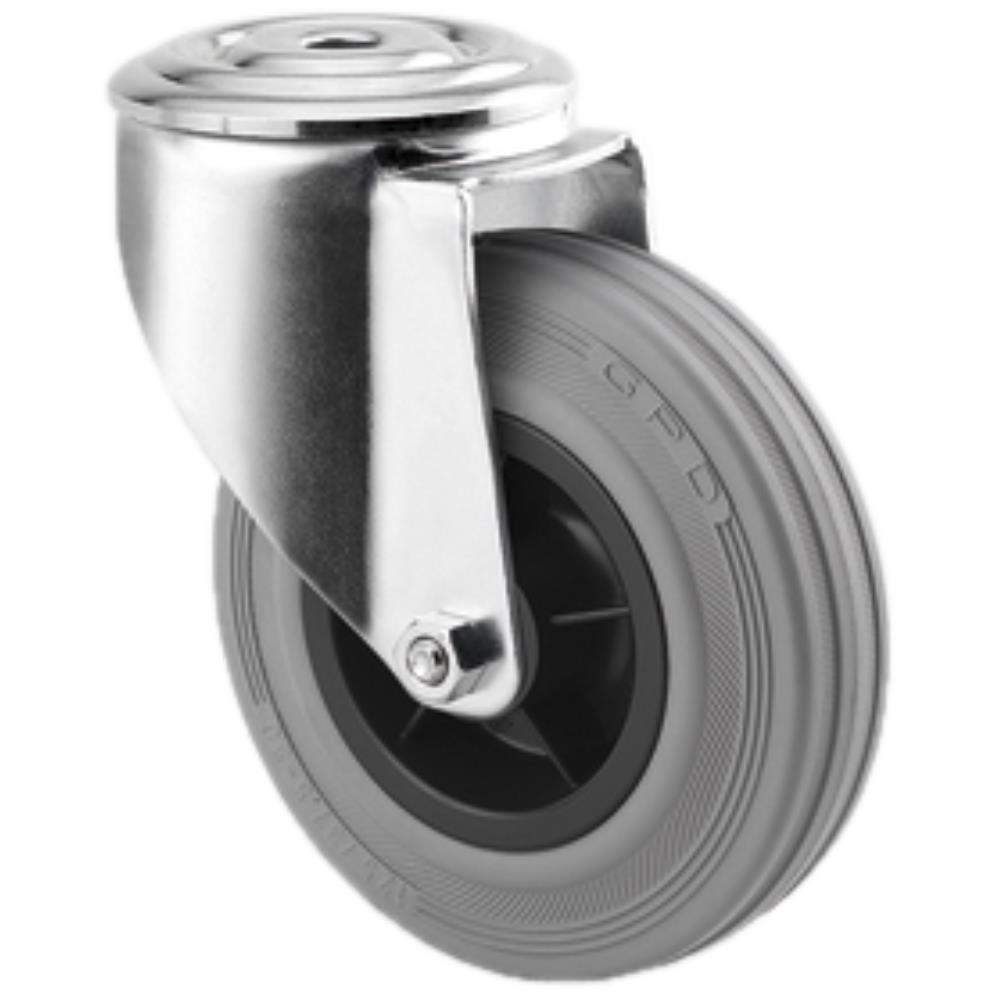 Drejeligt dobbelthjul med gaffel i svær stålplade med bred gaffelform og dobbelt kuglekrans. PP hjulfælg med grå massiv gummi samt rulleleje. Centerhulsbefæstigelse eller plade. Fås i flere dimensioner.