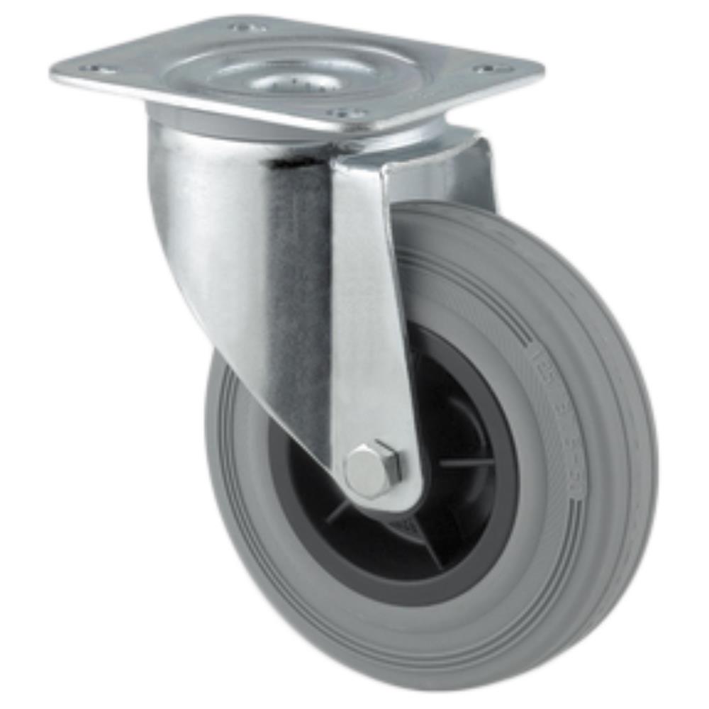 Drejeligt dobbelthjul med gaffel i svær stålplade med bred gaffelform og dobbelt kuglekrans. PP hjulfælg med grå massiv gummi samt rulleleje. Centerhulsbefæstigelse eller plade. Fås i flere dimensioner.