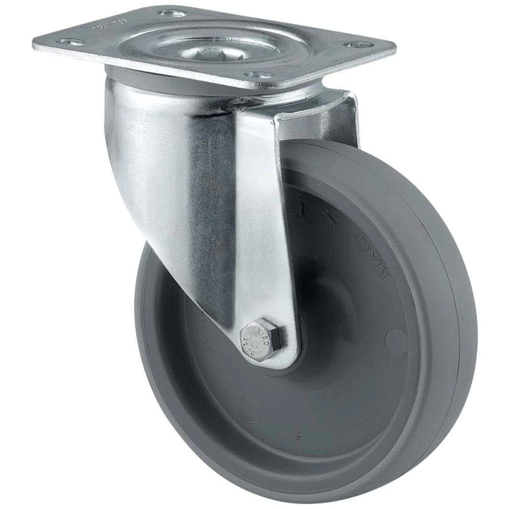 Slidstærkt Alpha drejehjul med bred gaffel af presset, forzinket og blåpassiveret stål og drejekrans med nittet, dobbelt kuglekrans med støvtætning. Hjulet er med pladebefæstigelse, fælg af polyamid, hjulbane af polyuretan og med rulleleje. Fås i flere varianter.