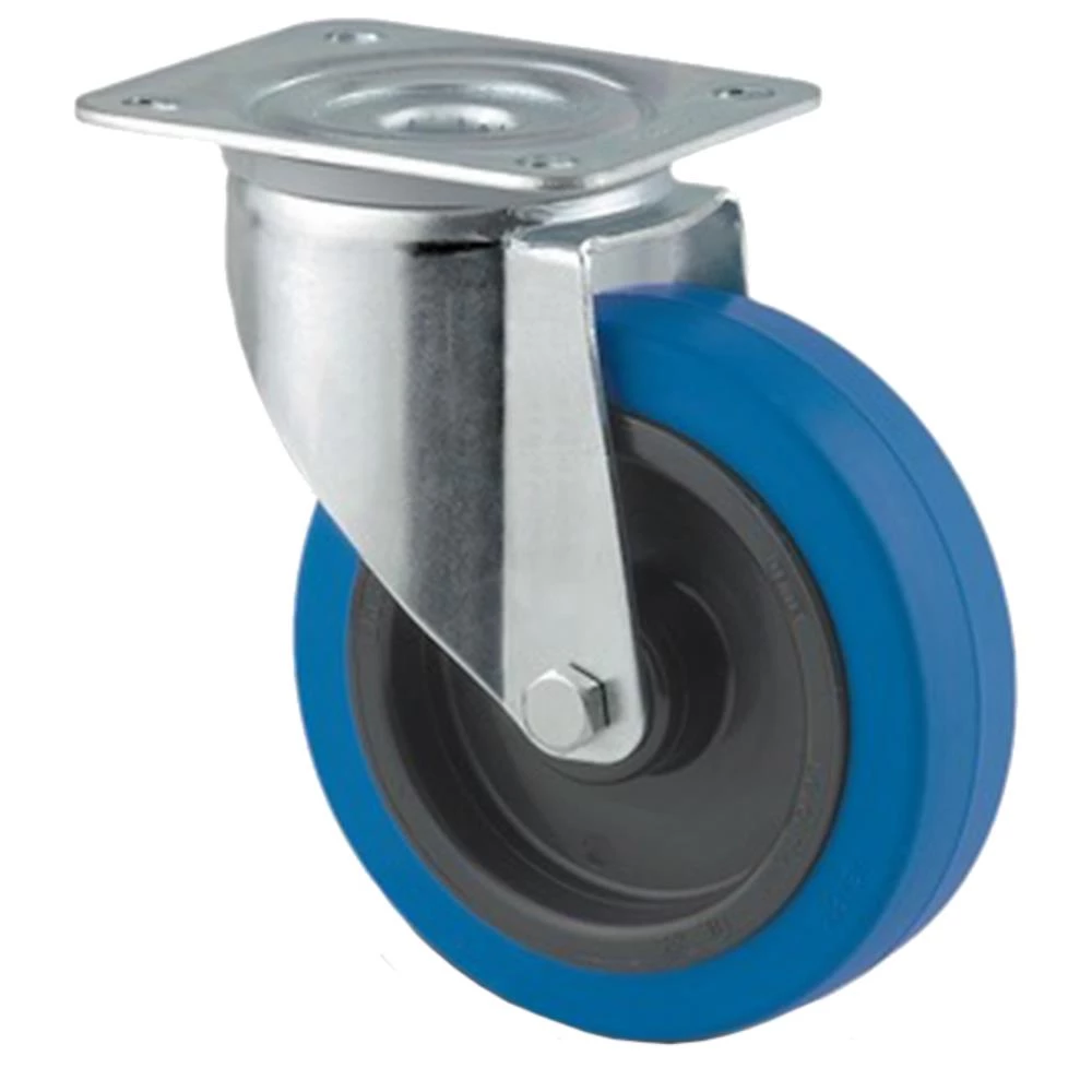 Drejeligt dobbelthjul med gaffel i svær stålplade med bred gaffelform og dobbelt kuglekrans. Nav i polyamide med blå elastisk gummibane og rulleleje. Med plade. Fås i flere dimensioner.