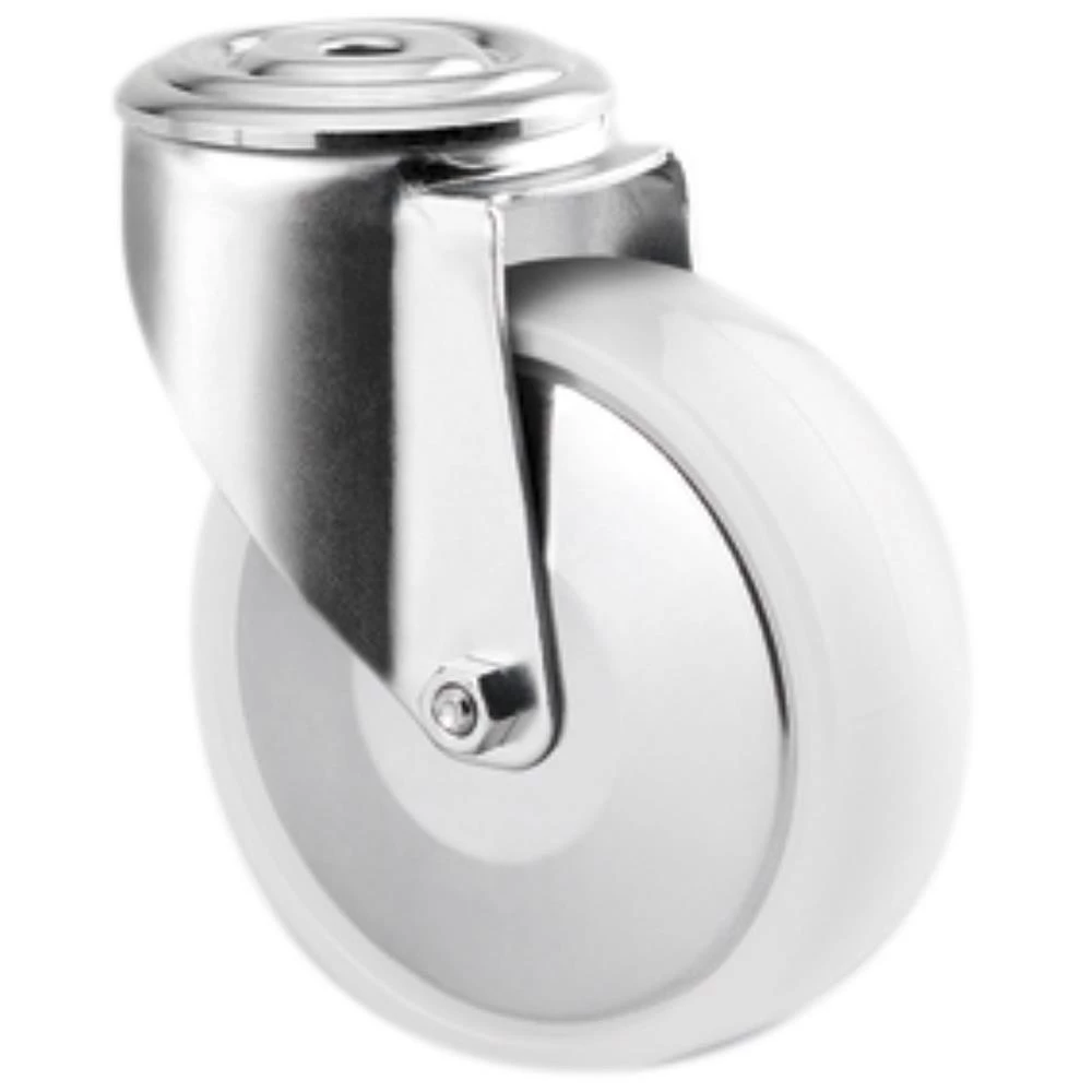 Drejeligt hjul med gaffel i svær stålplade med bred gaffelform og dobbelt kuglekrans. Nav og hjul i polyamid samt glideleje. Centerhulsbefæstigelse eller plade. Fås i flere dimensioner.