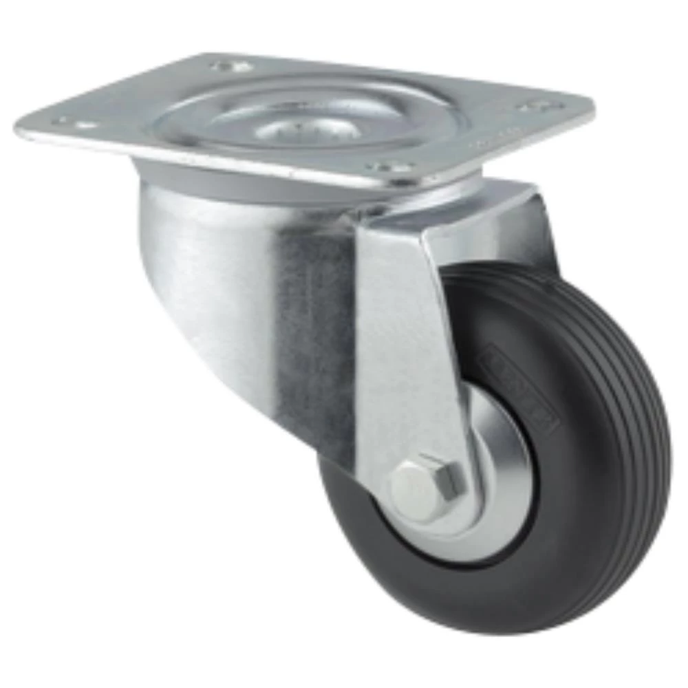 Drejehjul i Alpha-serien. Gaflen er af forzinket svær stålplade i bred form med nittet, dobbelt kuglekrans. Hjulfælg af polyamid med glideleje og trådfang. Hjulbanen er fremstillet af sort massiv gummi. Alpha hjulet giver medium rullemodstand og medium kørselsstøj. EN12532 standard. Denne model er med pladebefæstigelse.