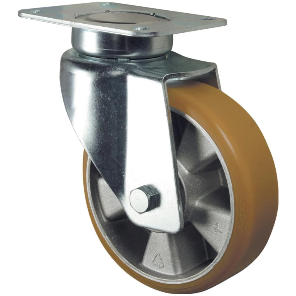 Drejeligt dobbelthjul med gaffel i svær stålplade med bred, forstærket gaffelform og DIN kugleleje. Nav i aluminium med polyuretanbane samt DIN-kugleleje. Med pladebefæstigelse. Fås i flere dimensioner.