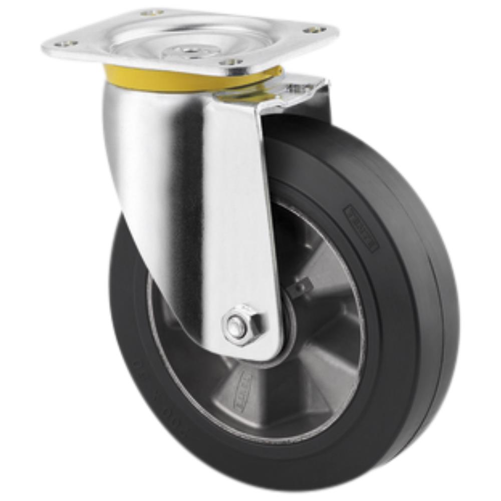Drejeligt hjul til sværlast. Med dobbelt kuglekrans, nittet. Nav i aluminium med sort gummibane. DIN-kugleleje. Med pladebefæstigelse. Fås i flere dimensioner.