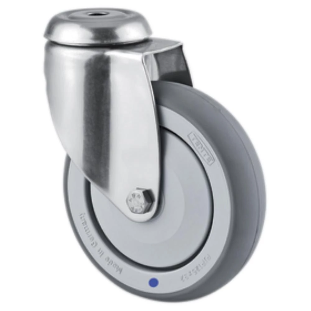 Drejeligt hjul med bred rustfri gaffel og dobbelt kuglekrans, nittet. Med polypropylen gummi og rustfri DIN-kugleleje. Med centerhulsbefæstigelse. Fås i flere dimensioner.