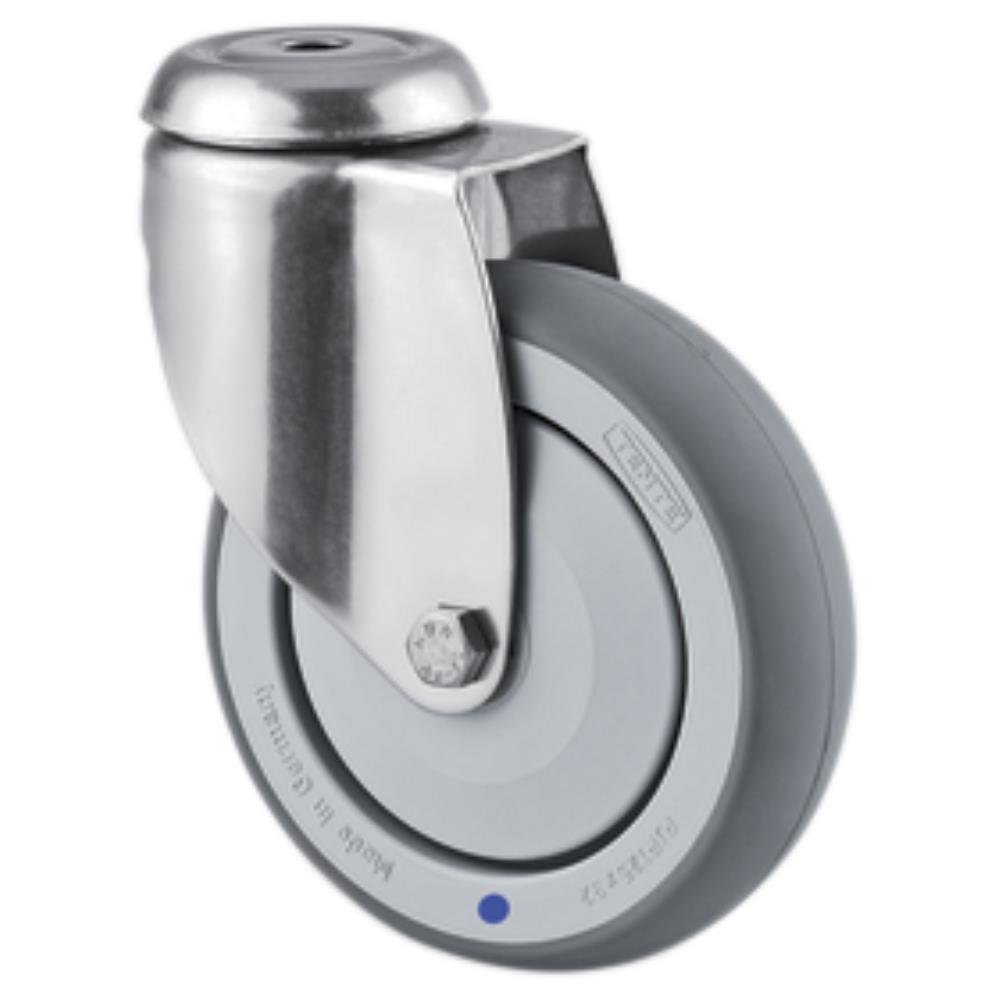 Drejeligt hjul med bred rustfri gaffel og dobbelt kuglekrans, nittet. Med polypropylen gummi og rustfri DIN-kugleleje. Med centerhulsbefæstigelse. Fås i flere dimensioner.