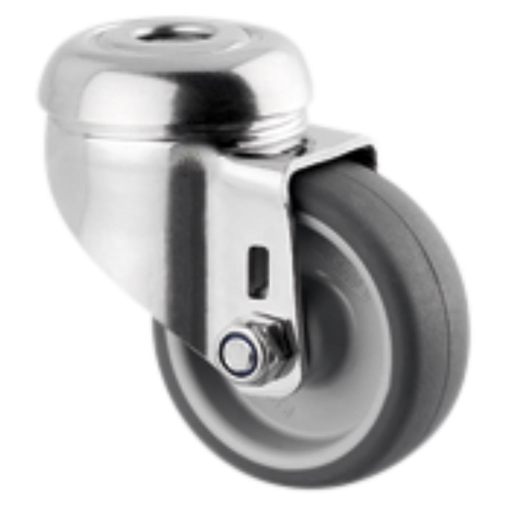 Drejeligt hjul med bred rustfri gaffel og dobbelt kuglekrans, nittet. Med polypropylen gummi og glideleje uden trådfang. Med centerhulsbefæstigelse eller plade. Fås i flere dimensioner.