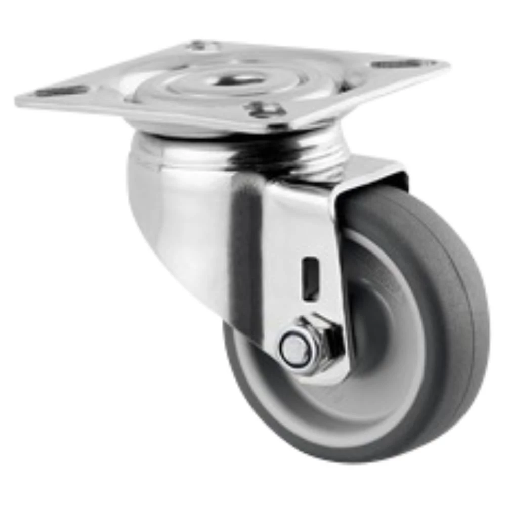 Drejeligt hjul med bred rustfri gaffel og dobbelt kuglekrans, nittet. Med polypropylen gummi og glideleje uden trådfang. Med centerhulsbefæstigelse eller plade. Fås i flere dimensioner.