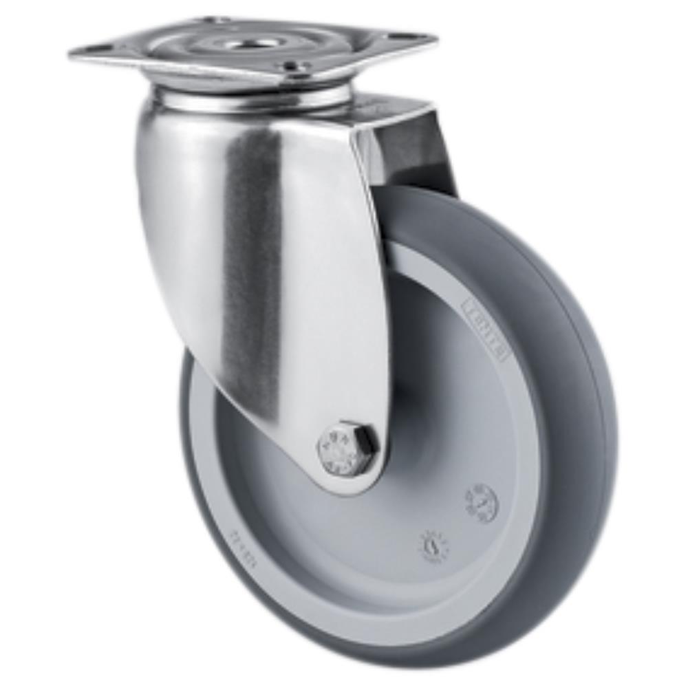 Drejeligt hjul med bred rustfri gaffel og dobbelt kuglekrans, nittet. Med polypropylen gummi og glideleje uden trådfang. Med centerhulsbefæstigelse eller plade. Fås i flere dimensioner.
