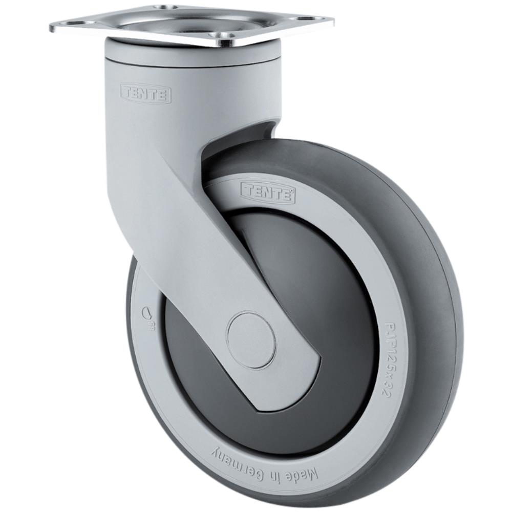 Drejeligt hjul med slank kunststof gaffel og dobbelt kuglekrans, nittet. Med polypropylen gummi og DIN-kugleleje. Med centerhulsbefæstigelse eller plade. Fås i flere dimensioner.
