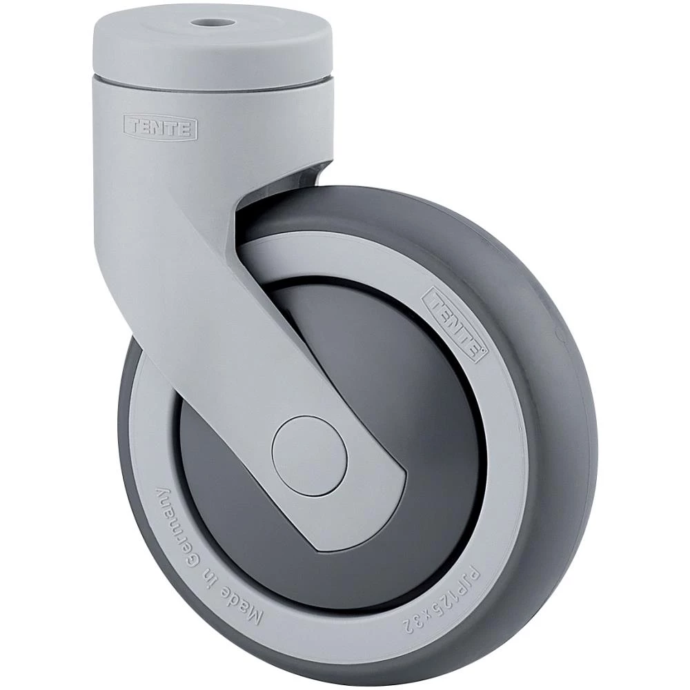 Drejeligt hjul med slank kunststof gaffel og dobbelt kuglekrans, nittet. Med polypropylen gummi og DIN-kugleleje. Med centerhulsbefæstigelse eller plade. Fås i flere dimensioner.