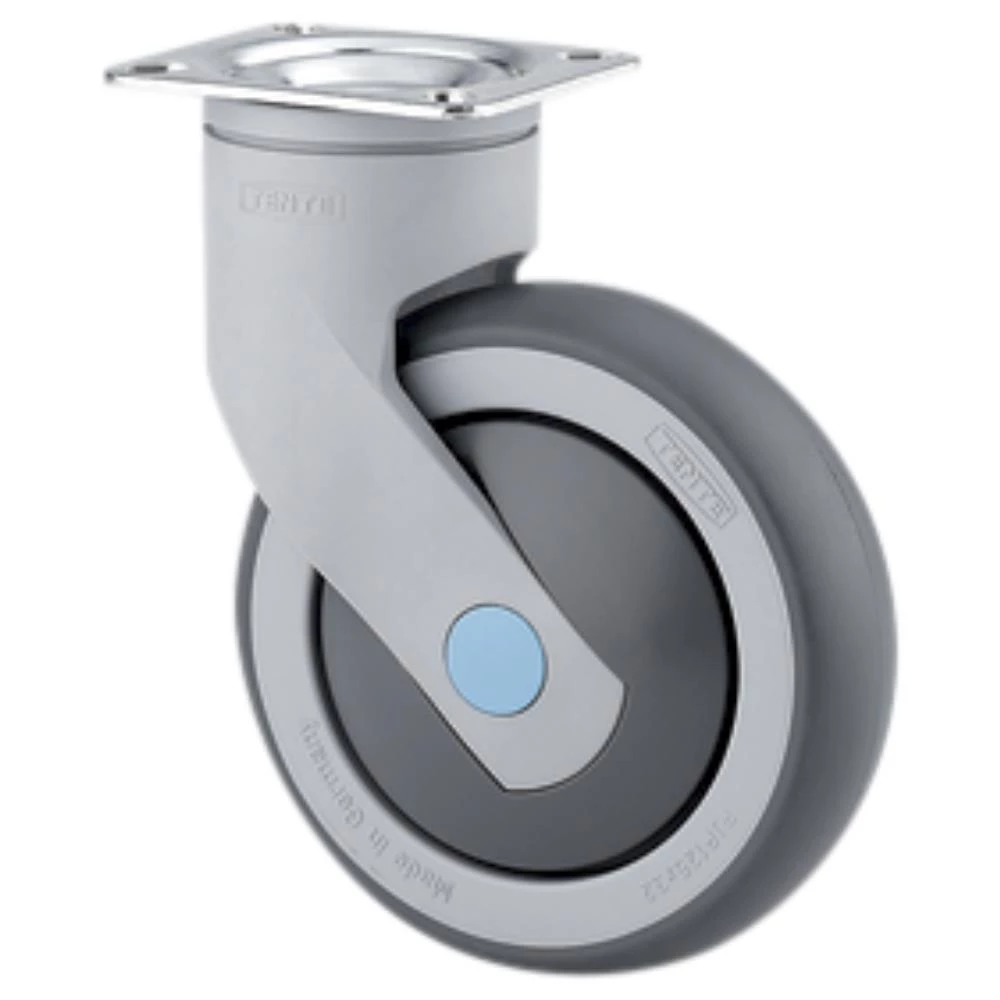Drejeligt hjul med slank kunststof gaffel og dobbelt kuglekrans, nittet. Med polypropylen gummi og rustfri DIN-kugleleje. Med centerhulsbefæstigelse eller plade. Fås i flere dimensioner.