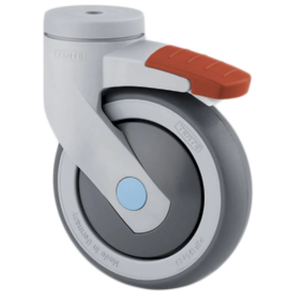 Levina-drejehjul med totalbremse. Gaflen er af polyamid i slankt design med nittet, dobbelt kuglekrans. Hjulfælg af polypropylen med rustfri DIN-kugleleje. Hjulbanen er fremstillet af afsmitningsfri grå termoplastisk gummi. Levina hjulet giver medium rullemodstand og er godkendt efter EN12530 standarden. Denne model er med bolthulsbefæstigelse.