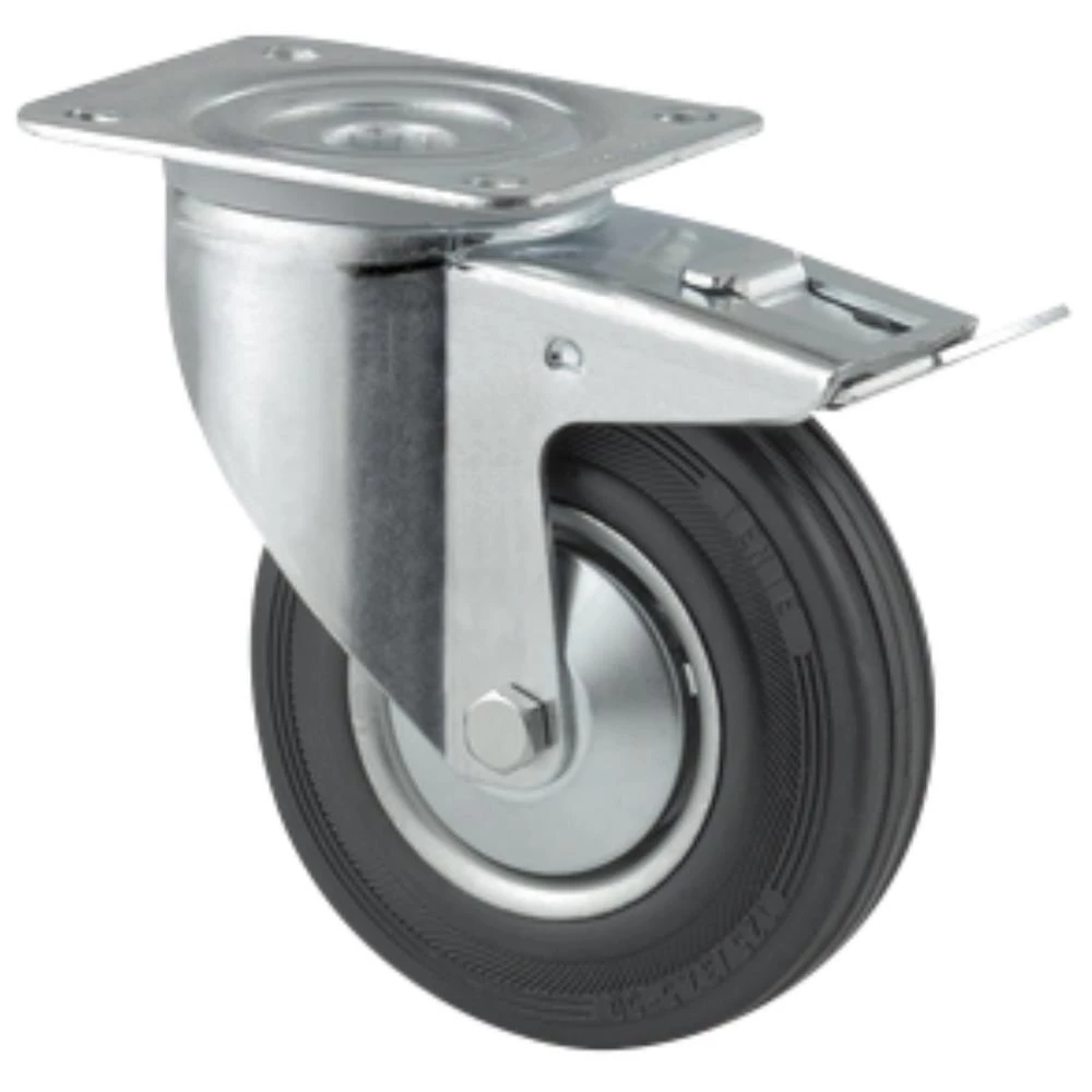 Drejeligt hjul med totalbremse. Med svær stålplade, bred gaffel og dobbelt kuglekrans, nittet. Svejst stålfælg med sort massiv gummi samt rulleleje med trådfang. Med pladebefæstigelse. Fås i flere dimensioner.