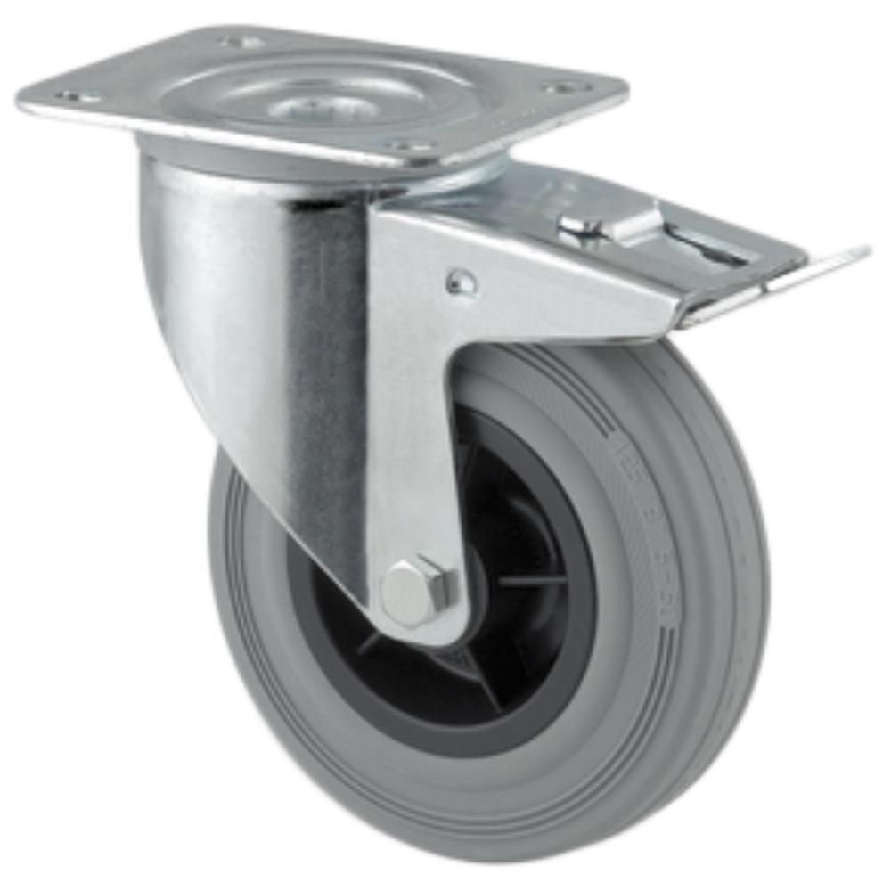 Drejeligt hjul med totalbremse. Med svær stålplade, bred gaffel og dobbelt kuglekrans, nittet. Grå massiv gummi og rulleleje uden trådfang. Med centerhulsbefæstigelse eller plade. Fås i flere dimensioner.