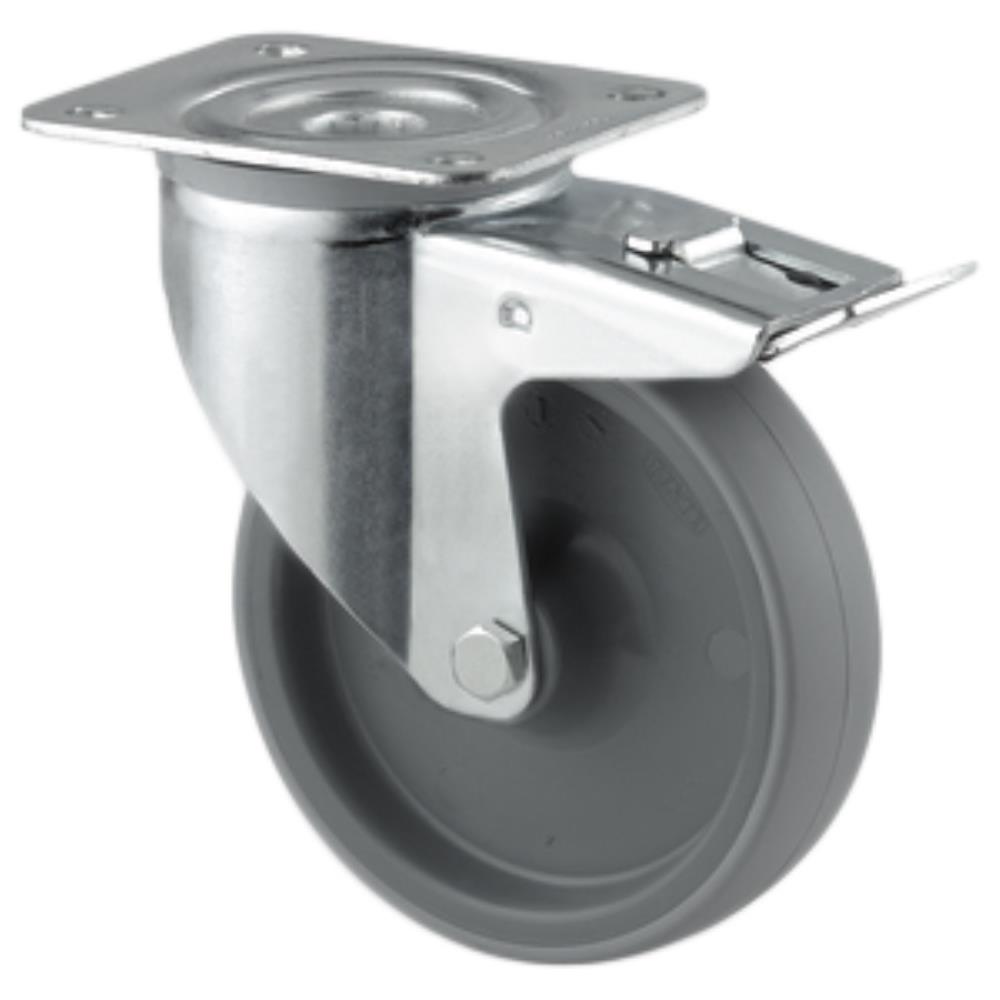 Drejeligt hjul med bremse, 80 mm. Transport, belastning 150 kg. Nav i polyamide med polyuretanbane. Rulleleje. GRÅ