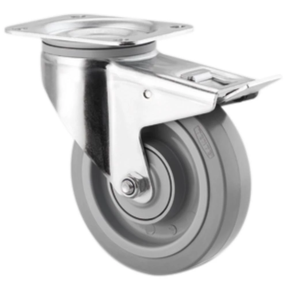 Drejeligt hjul med totalbremse. Med svær stålplade, bred gaffel og dobbelt kuglekrans, nittet. Nav i polyamide med elastisk gummibane. Rulleleje uden trådfang. Med pladebefæstigelse. Fås i flere dimensioner.