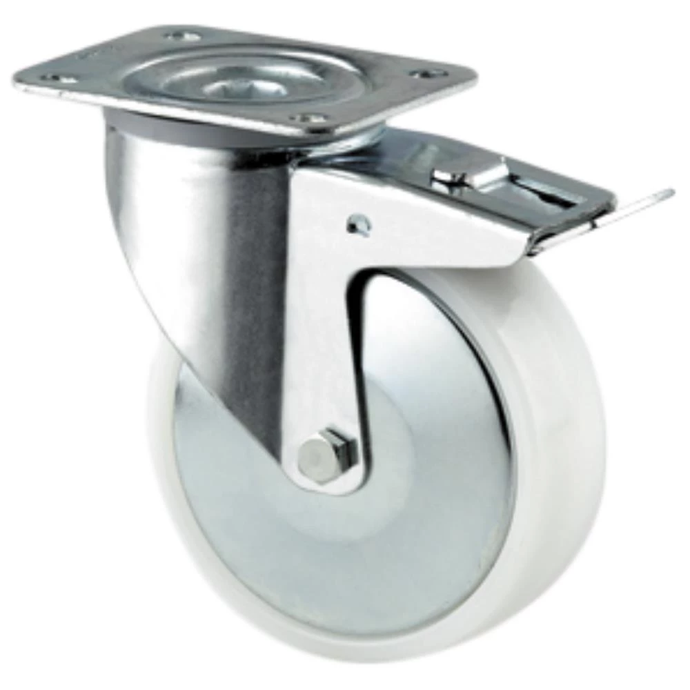 Drejeligt hjul med totalbremse. Med svær stålplade, bred gaffel og dobbelt kuglekrans, nittet. Nav og hjul i hvid polyamide. Glideleje med trådfang. Med pladebefæstigelse. Fås i flere dimensioner.