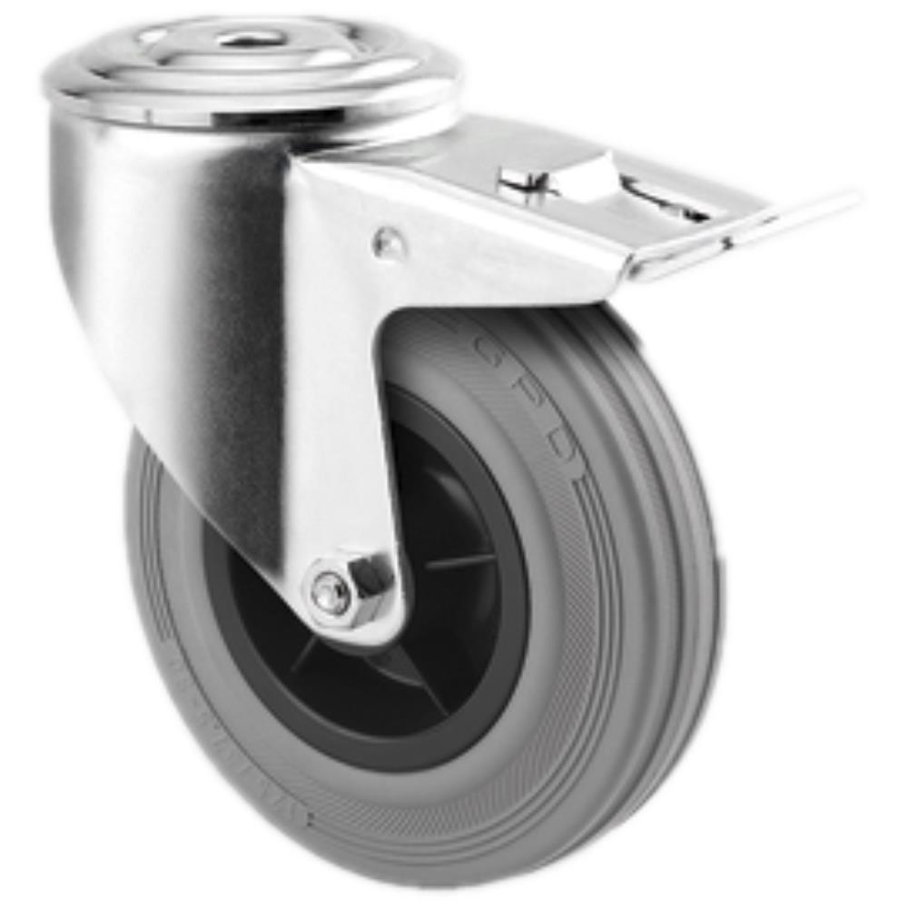 Drejeligt hjul med totalbremse. Med svær stålplade, bred gaffel og dobbelt kuglekrans, nittet. Grå massiv gummi og rulleleje uden trådfang. Med centerhulsbefæstigelse eller plade. Fås i flere dimensioner.