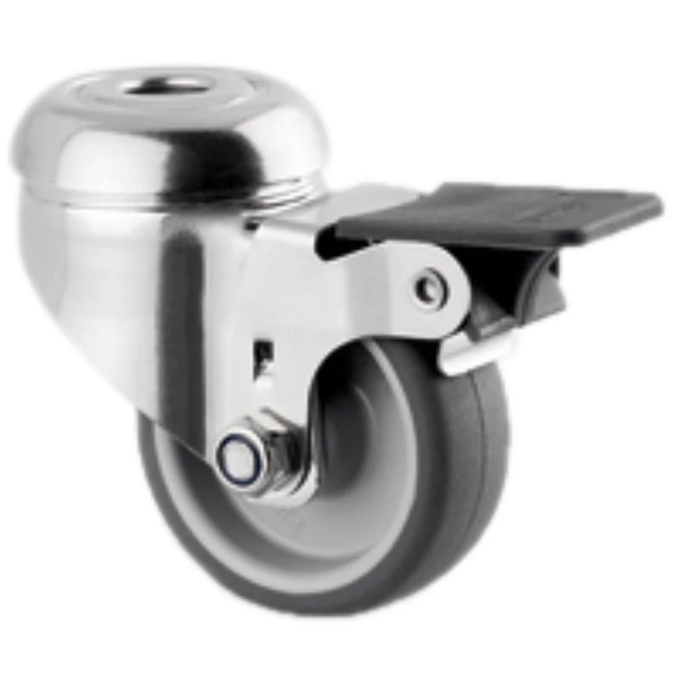 Drejeligt hjul med totalbremse. Rustfri, med bred gaffel. Dobbelt kuglekrans. Polypropylen grå gummi samt glideleje uden trådfang. Med centerhulsbefæstigelse eller plade. Fås i flere dimensioner.