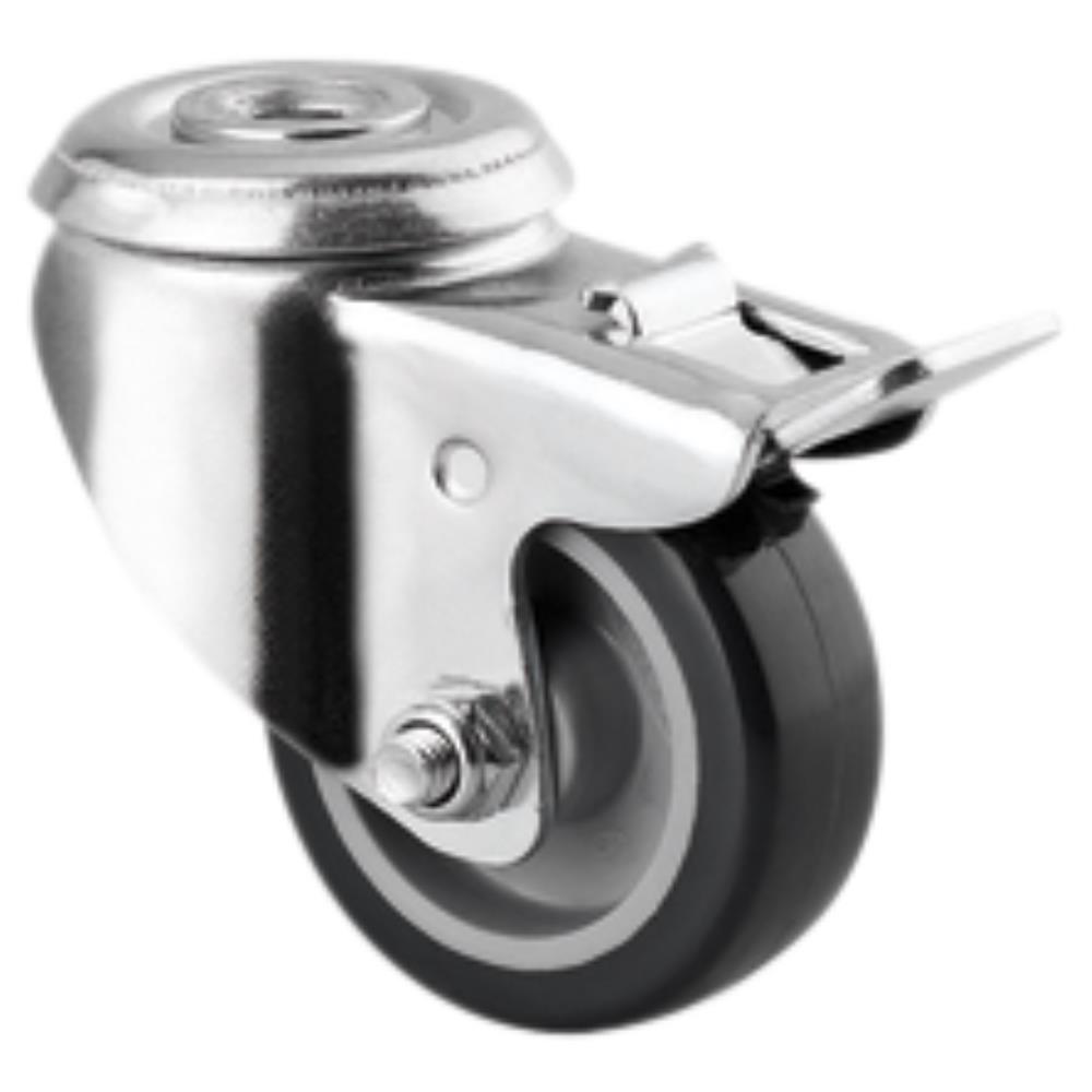 Drejeligt hjul med bremse, let stålplade med bred gaffel og dobbelt kuglekrans, nittet. Gummihjul med glideleje uden trådfang. Med centerhulsbefæstigelse eller plade.