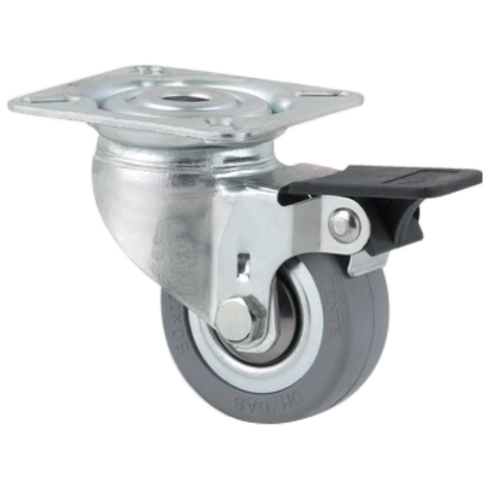 Drejeligt hjul med bremse, medium stålplade, bred gaffel og dobbelt kuglekrans, nittet. Svejst stålfælg med grå gummi og konus-kugleleje. Med centerhulsbefæstigelse eller plade.