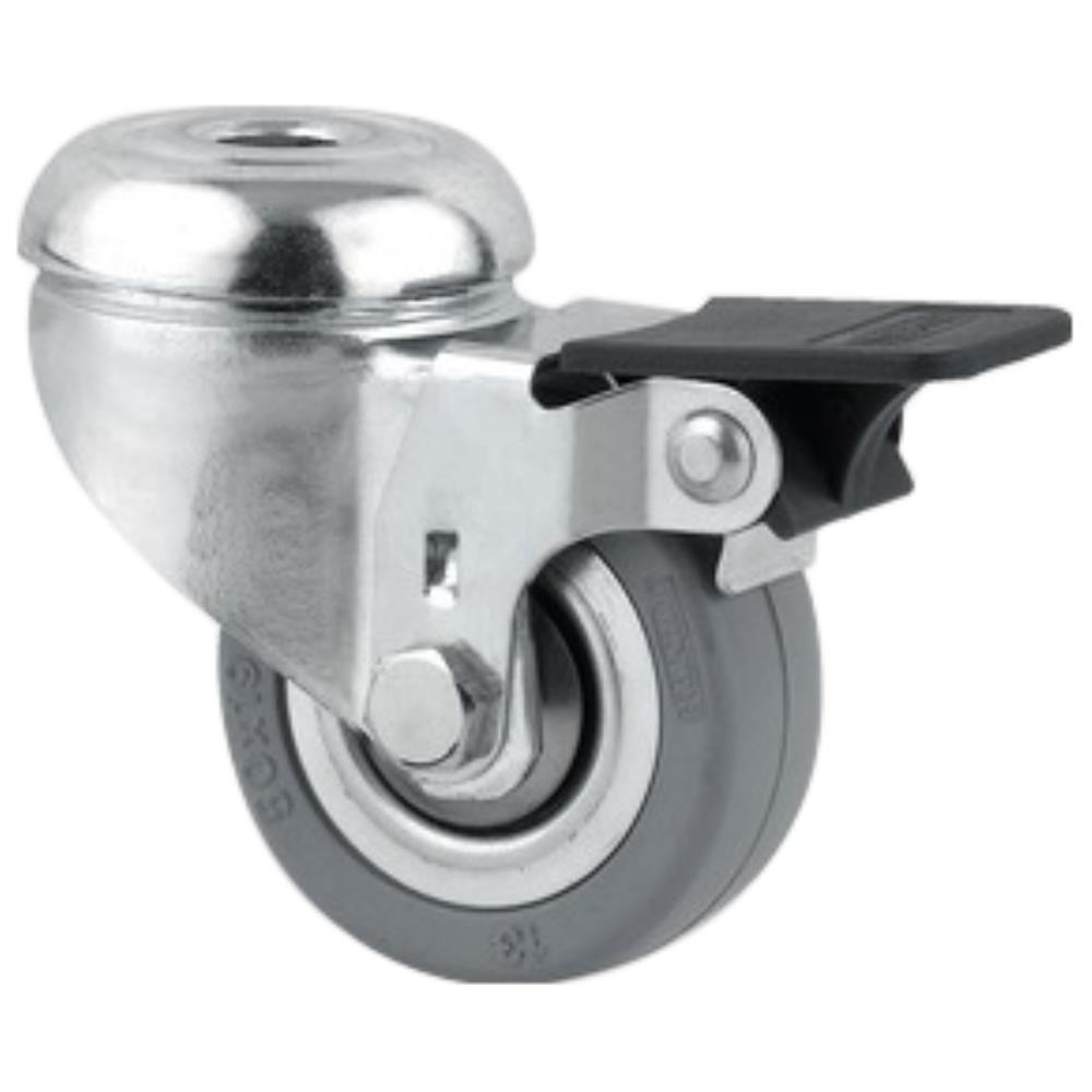 Drejeligt hjul med bremse, medium stålplade, bred gaffel og dobbelt kuglekrans, nittet. Svejst stålfælg med grå gummi og konus-kugleleje. Med centerhulsbefæstigelse eller plade.