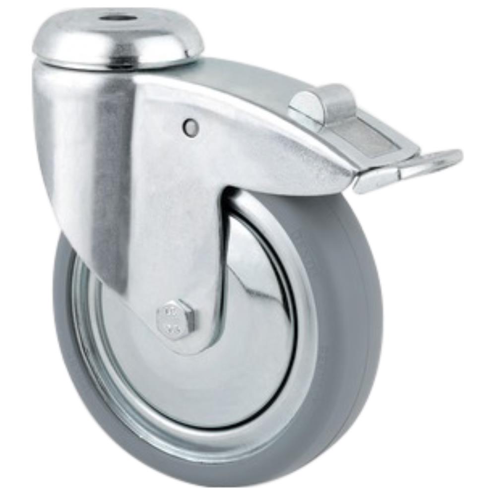 Drejeligt hjul med totalbremse, medium stålplade, bred gaffel og dobbelt kuglekrans, nittet. Svejst stålfælg med grå gummi og konus-kugleleje. Med centerhulsbefæstigelse eller plade. Fås i flere dimensioner.