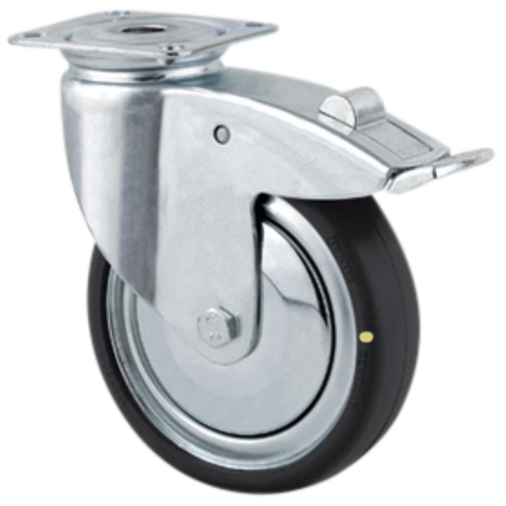 Drejeligt hjul med totalbremse, medium stålplade, bred gaffel og dobbelt kuglekrans, nittet. Svejst stålfælg med sort massiv ESD gummi og konus-kugleleje. Med centerhulsbefæstigelse eller plade. Fås i flere dimensioner.