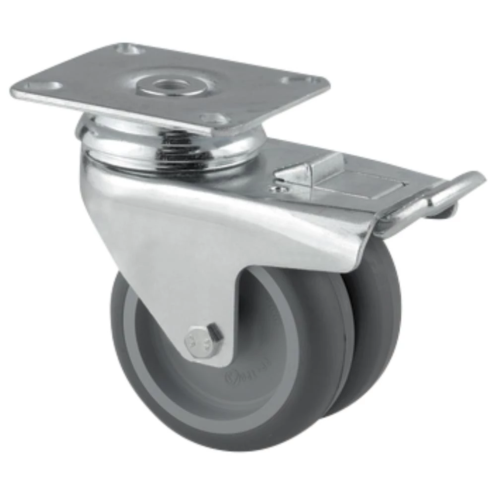 Drejeligt dobbelthjul med bremse, 75 mm, grå gummi, glideleje, plade, 100 kg