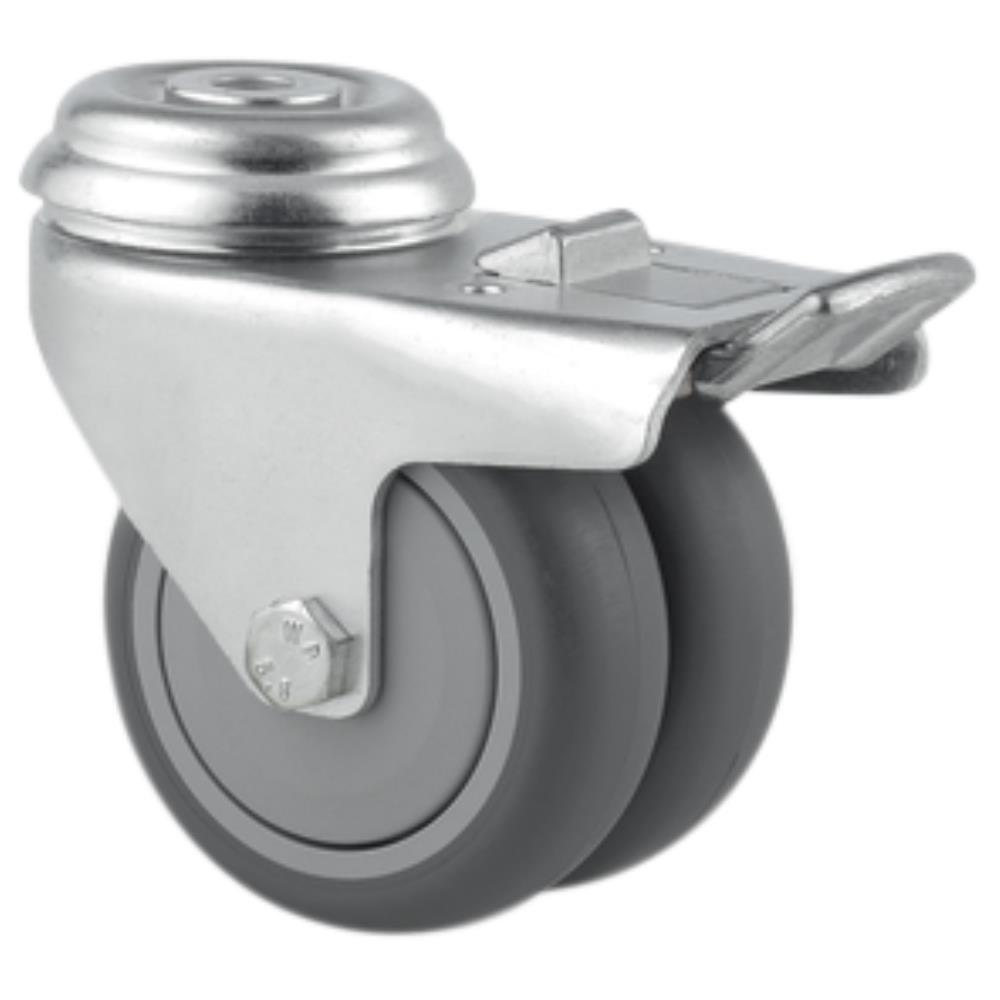 Agila Twin drejeligt dobbelthjul med totalbremse, gaffel af presset forzinket blåpassiveret stål, drejekrans med dobbelt kuglekrans og hjulaksel med møtrik. Sølvgrå polypropylenfælg med blød hjulbane af termoplastisk gummi og DIN kugleleje. Agila Twin hjul giver god rullemodstand og meget lidt kørselsstøj. EN 12530 Hjul til Apparater. Fås i flere varianter.