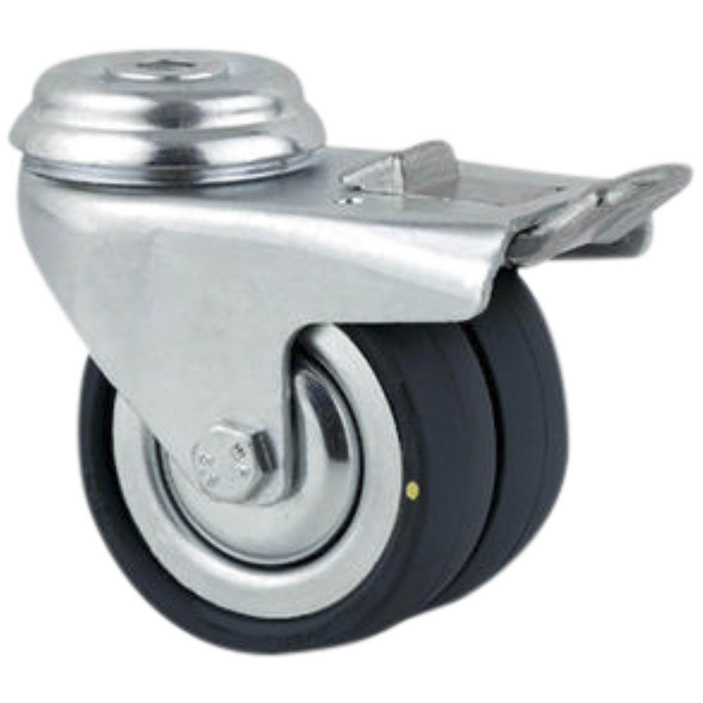 Drejeligt dobbelthjul med totalbremse. Medium stålplade og dobbelt kuglekrans, nittet. Svejst stålfælg med sort massiv ESD gummi og konus-kugleleje. Med centerhulsbefæstigelse eller plade.