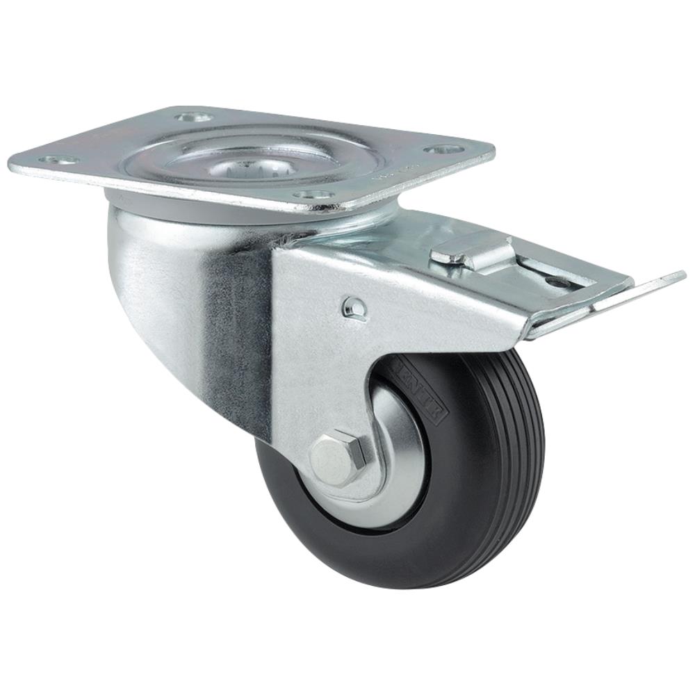 Alpha drejehjul med totalbremse. Polyamidfælg med glideleje og blød hjulbane i massiv sort gummi. Bred gaffel i tung stålplade og drejekrans med dobbelt kuglekrans. Temperaturområde: ÷20° til +80°C. EN 12532 standard.