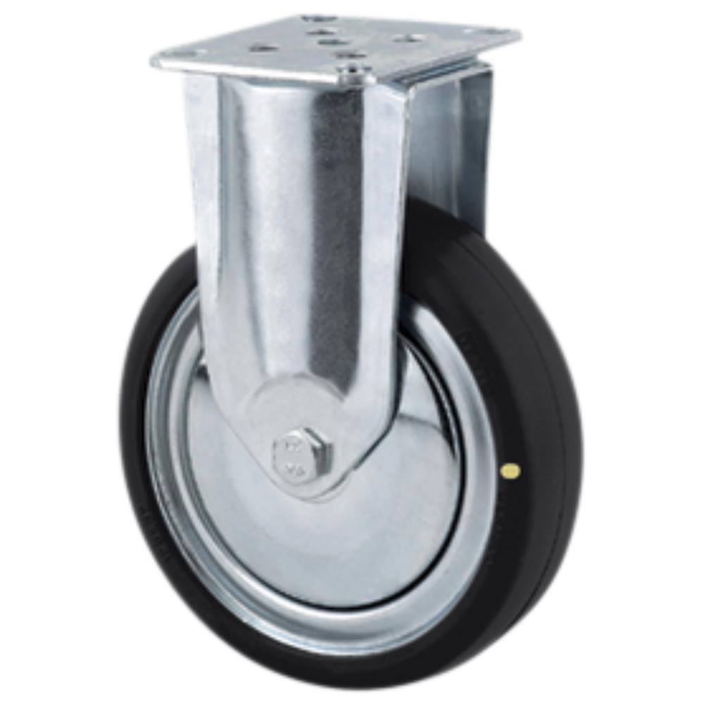Fast hjul med bred, ret gaffel i let stålplade samt dobbelt kuglekrans. Svejst stålfælg med grå ESD gummi og konus-kugleleje. Med pladebefæstigelse. Fås i flere dimensioner.