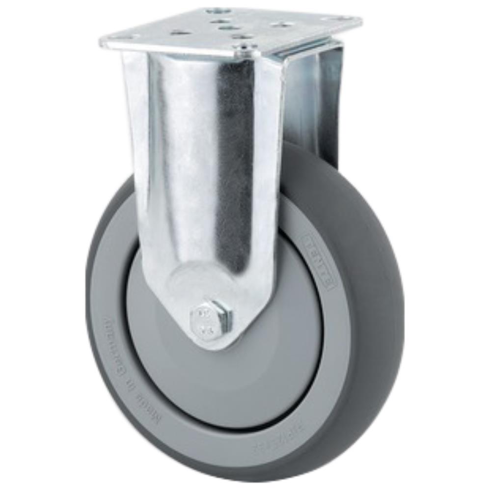 Fast hjul med bred, ret gaffel i let stålplade samt dobbelt kuglekrans. Polypropylen grå gummi og DIN-kugleleje. Med pladebefæstigelse. Fås i flere dimensioner.
