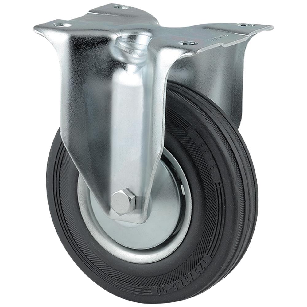 Fast hjul med bred, ret gaffel i svær stålplade samt dobbelt kuglekrans. Fælg af svejst stål med rulleleje med trådfang. Hjulbanen er fremstillet af sort massiv gummi. Med pladebefæstigelse. Fås i flere dimensioner.