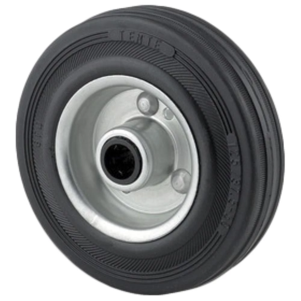 Løst hjul med nav i svejst stål med sort massiv recycled gummi og rulleleje uden trådfang. Fås i flere dimensioner.