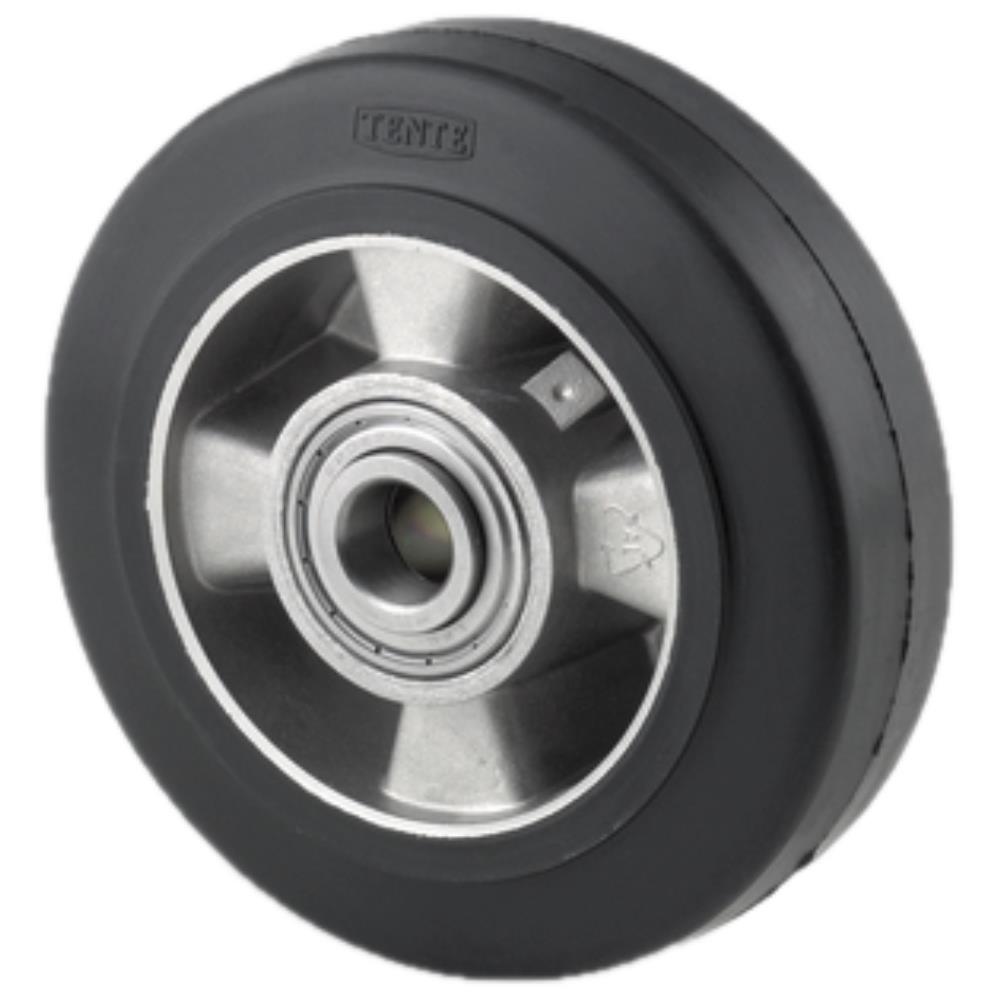 Løst hjul med nav i aluminium med elastisk, sort vulkaniseret gummi samt DIN-kugleleje. Fås i flere dimensioner.