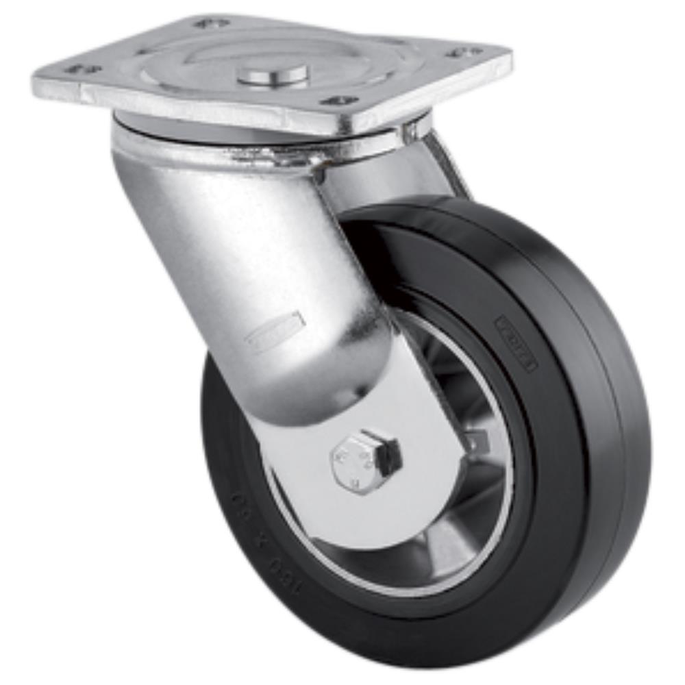 Drejeligt hjul, ekstra sværlast med bred gaffel med nittet dobbelt kuglekrans. Nav i aluminium med elastisk, vulkaniseret sort gummibane samt DIN-kugleleje. Til pladebefæstigelse. Fås i flere dimensioner.