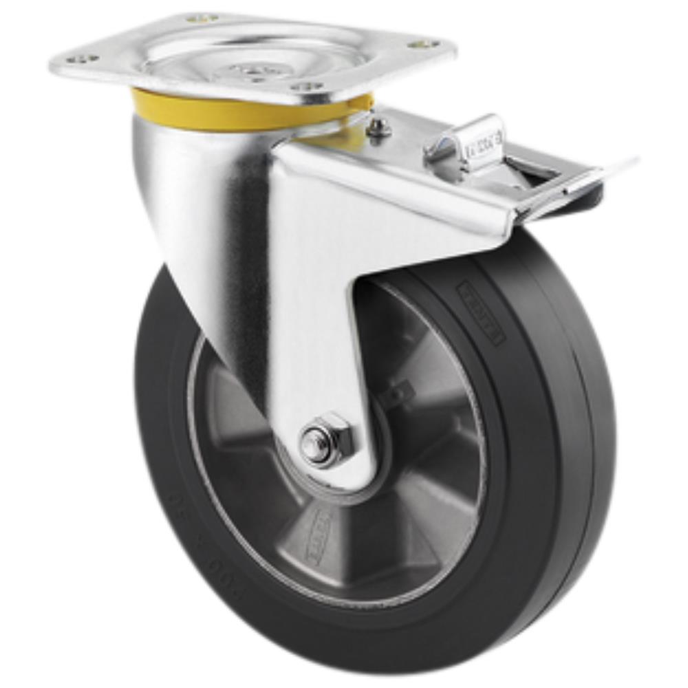 Drejeligt hjul med totalbremse, sværlast med bred gaffel med nittet dobbelt kuglekrans. Nav i aluminium med elastisk, vulkaniseret sort gummibane samt DIN-kugleleje. Til pladebefæstigelse. Fås i flere dimensioner.