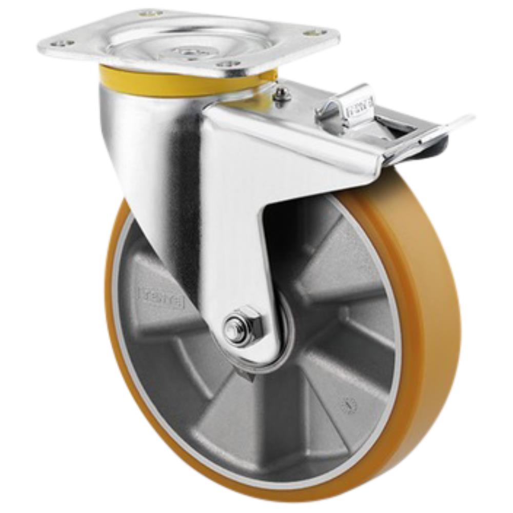 Drejeligt hjul med totalbremse, sværlast med bred gaffel med nittet dobbelt kuglekrans. Nav i aluminium med polyuretan gummibane samt DIN-kugleleje. Til pladebefæstigelse. Fås i flere dimensioner.