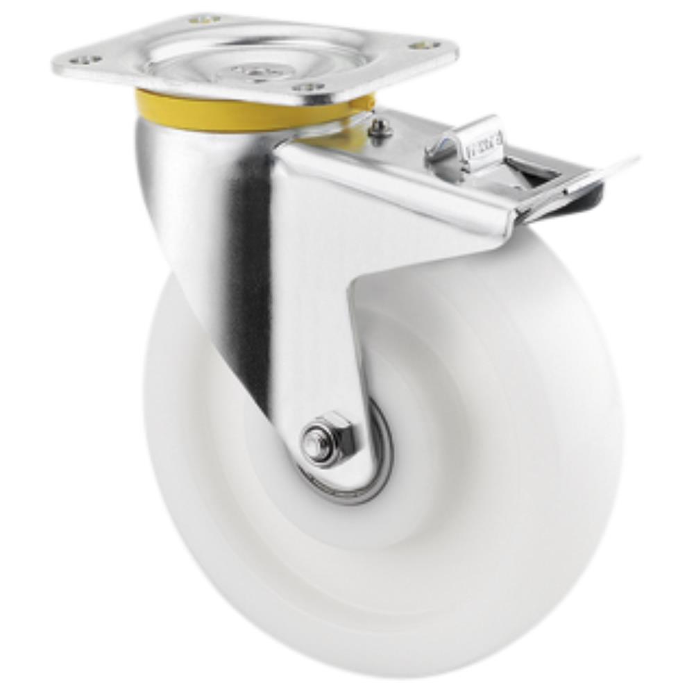 Drejeligt hjul med totalbremse, sværlast med bred gaffel med nittet dobbelt kuglekrans. Nav og hjul i hvid polyamid med DIN-kugleleje. Til pladebefæstigelse. Fås i flere dimensioner.