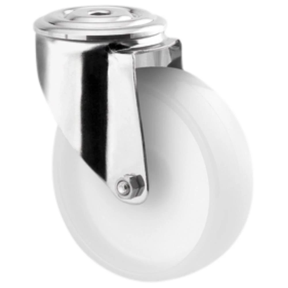 Drejeligt transporthjul i rustfri med bred gaffel og nittet dobbelt kuglekrans. Hvid polyamid med glideleje uden trådfang. Med centerhul- eller pladebefæstigelse. Fås i flere dimensioner.