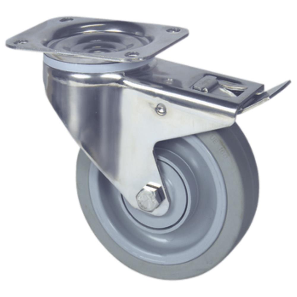 Drejeligt transporthjul i rustfri med totalbremse, bred gaffel og nittet dobbelt kuglekrans. Nav i polyamide med elastisk gummibane samt DIN-kugleleje med gummitætning. Med centerhul- eller pladebefæstigelse. Fås i flere dimensioner.