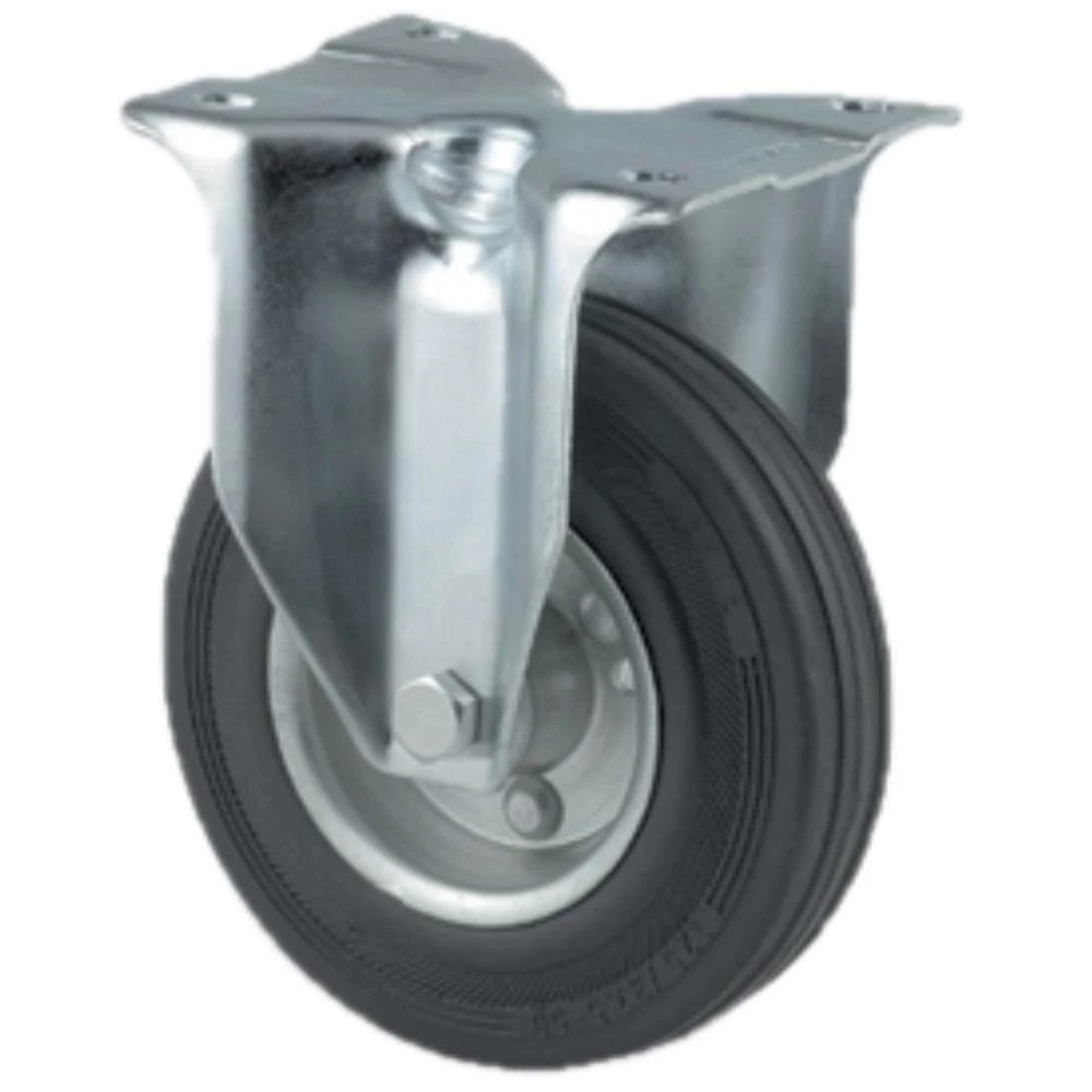 Fast hjul med bred gaffel i svær stålplade. Fælg i svejst stål med sort massiv ESD gummi og rulleleje uden trådfang. Med pladebefæstigelse. Fås i flere dimensioner.